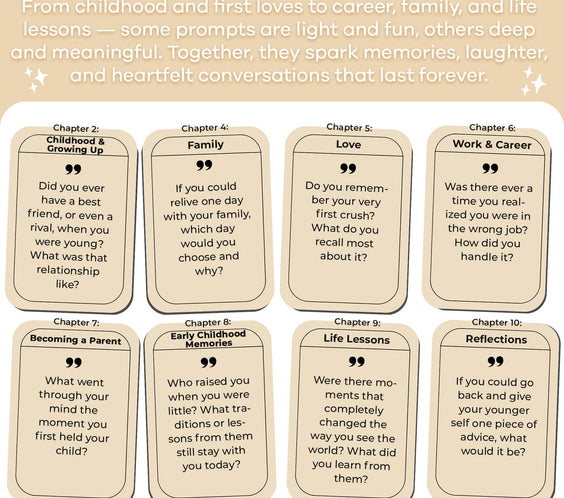 The prompts cover every stage of life, from childhood, youth, and first loves to marriage, parenthood, career, dreams, and lessons learned. Each question is crafted to spark memories and meaningful stories that might otherwise remain untold.